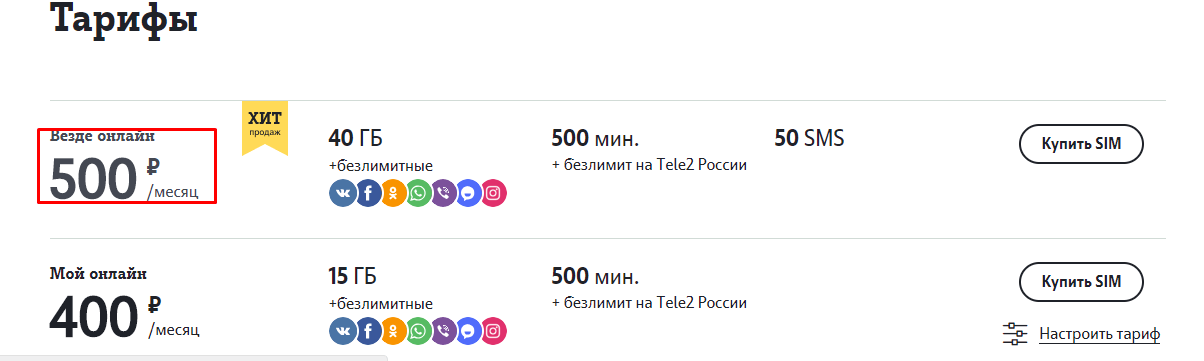 Абонентская плата составляет 500 рублей в месяц. За эту стоимость пользователь получает безлимит для: Вконтакте, Одноклассников, Facebook, Instagram, Viber, WhatsApp и ТамТам. Также безлимитный трафик распространяется на сервисы «Звук» и «Tele2 TV».