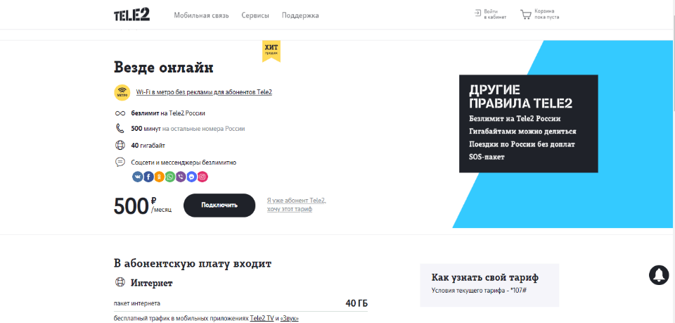 Для остальных сайтов и порталов разработан пакет на 40 Гб. Тарифный план также предлагает безлимитные звонки внутри сети и пакет из 500 минут для исходящих вызовов на номера по всей России. Подключить можно по команде: .