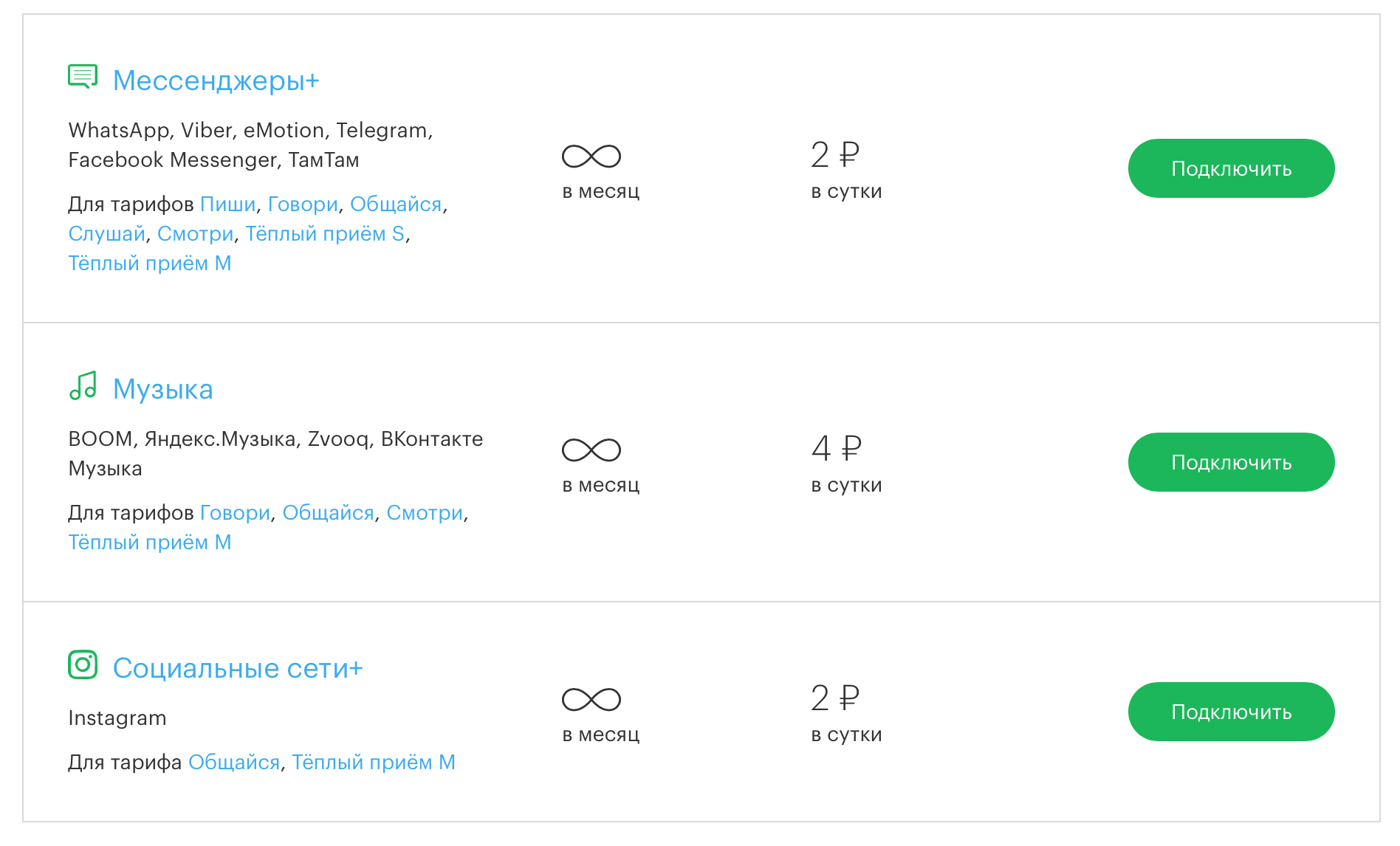 В отличие от более дешевого «Включайся! Пиши», безлимитный интернет во «Включайся! Общайся» дается не только на мессенджеры, но и соцсети (если не подключать опцию с безлимитом на все). В списке все самые популярные социалки в России: ВКонтакте, Одноклассники, Фейсбук, Инстаграм и Твиттер.