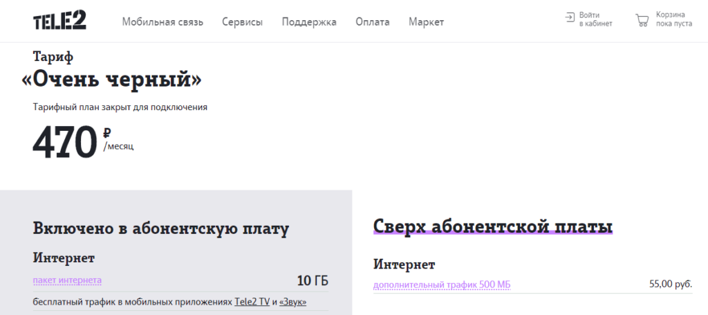 Продукт от Теле2 «Очень черный» предлагает внушительный пакет интернет-трафика в размере 10 гигабайт, 500 минут и 500 смс на общение с абонентами на всей территории России. Абонентская плата составляет 470 рублей в месяц. Предоставляется безлимит в мобильных приложениях Tele2 TV и «Звук». После того как пакеты будут истрачены, пользователь остается на связи, а услуги начинают тарифицироваться иначе. Более подробная информация: