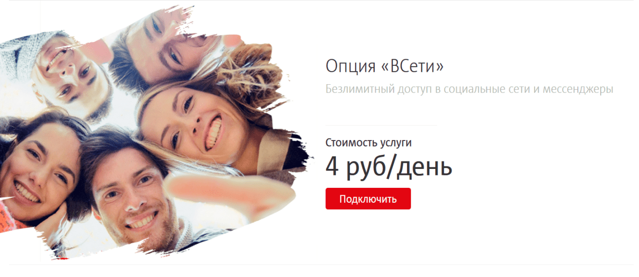 Для экономии трафика рекомендуется активировать услугу «Всети». Она предоставляет безлимитный доступ к соцсетям, мессенджерам и развлекательным сервисам. То есть трафик, израсходованный на подобных ресурсах, не учитывается при подсчете ежемесячного пакета.