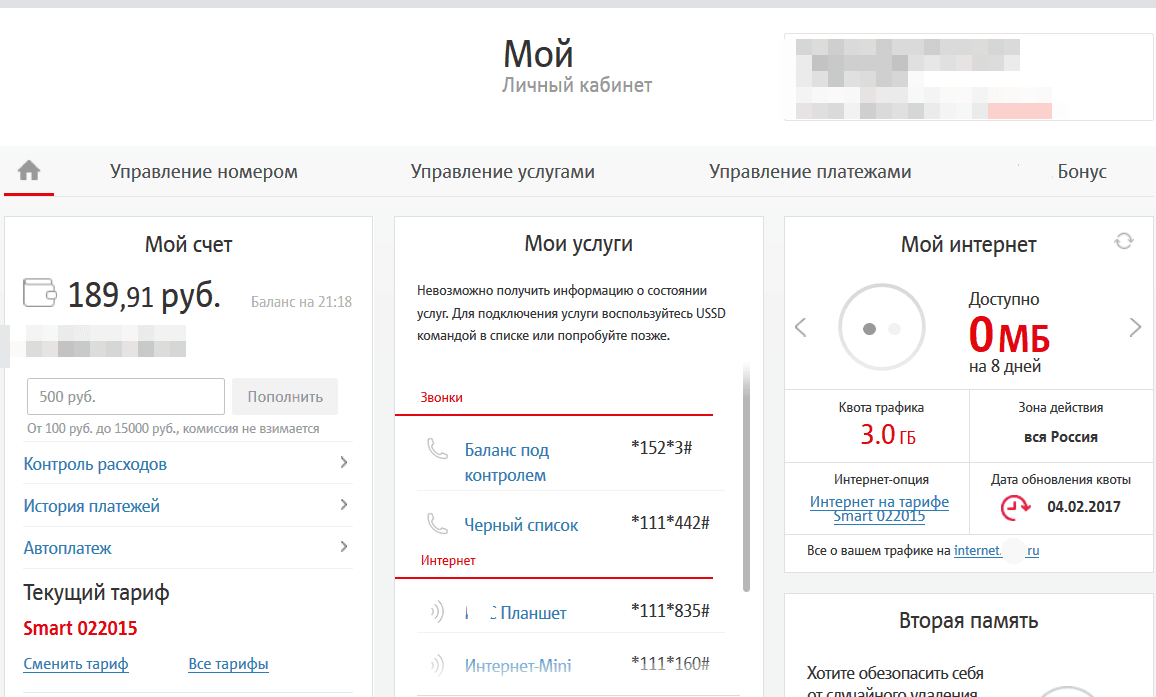 Внешний вид главной страницы личного кабинета МТС