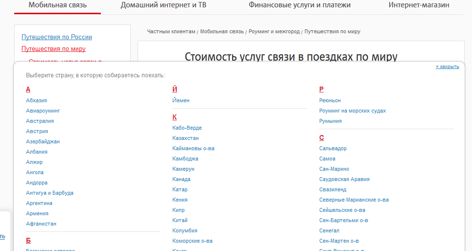 Выбор страны и города для определения стоимости Роуминга