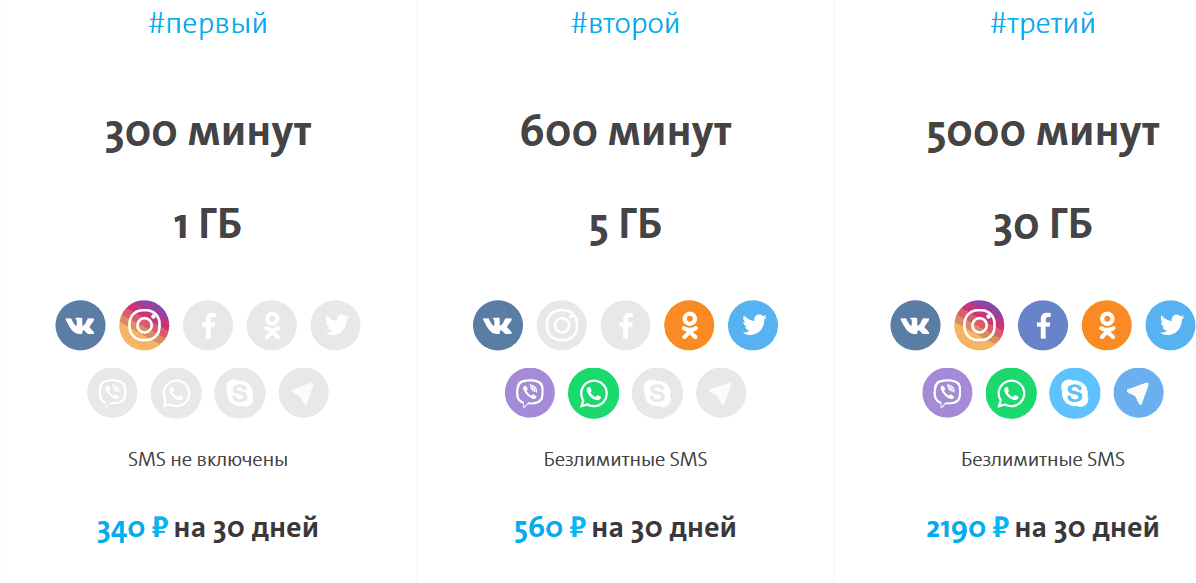 | Возможность выбрать 1 сервис и платить только за него. Выгодно для тех, кто использует мобильный трафик для 1-2 ресурсов. | Дороже обходится пакет различных сервисов. Невыгодно для тех, кто использует много различных соцсетей. |