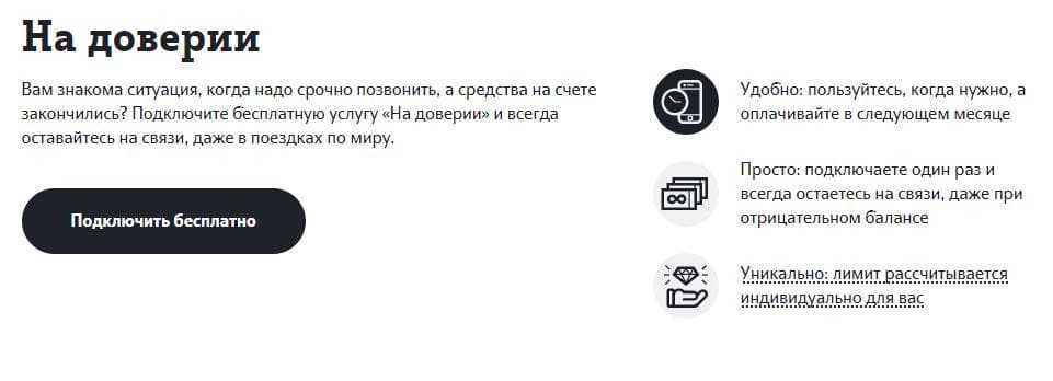 Постоплатная система для многих была бы удобнее – особенно, если вы никогда точно не знаете, сколько денег на связь потратите. Но она по большей части доступна лишь корпоративным клиентам. При помощи услуги “На доверии” подобная система, пусть и с ограничениями, становится доступна и физическим лицам.