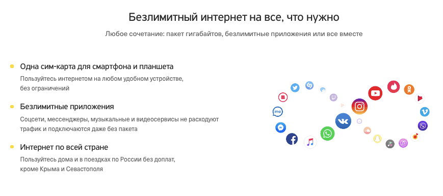 За 59 руб./мес. можно дополнительно оформить безлимитный доступ к популярным мессенджерам (What’s up, Viber и тд.), социальным сетям (ВКонтакте, Facebook, Одноклассники, Instagram) или подписку на музыку (Apple Music, Яндекс.Музыка, Google Play Music).