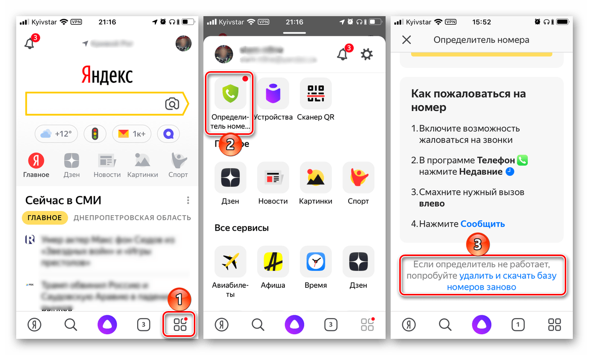 Вернувшись к интерфейсу Определителя Яндекс после его активации в «Настройках» или просто повторно запустив приложение, вы увидите информацию о том, как проверить номер, а также как включить возможность жаловаться о спаме и в дальнейшем ее использовать. Начнем с последнего.