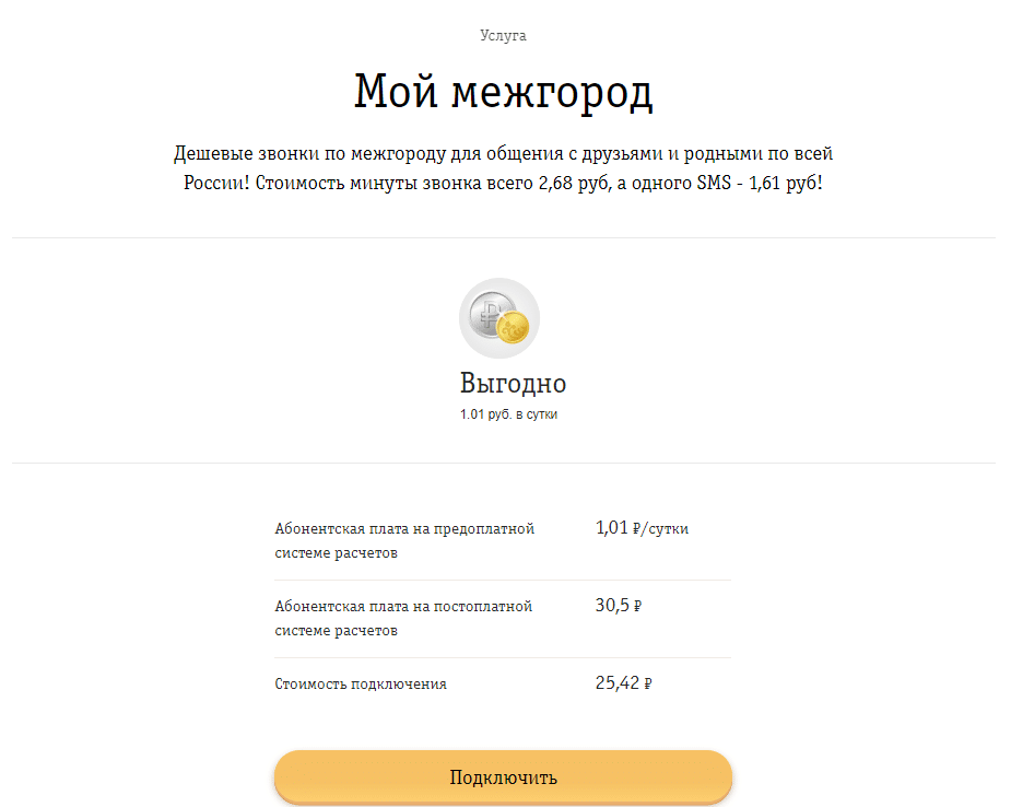 Стоимость услуги 0 для тарифных планов «Тарифское», «Мой безлимитный», «Мой Смарт» и «Смарт Забугорье»), 4,2 ₽ — для остальных.