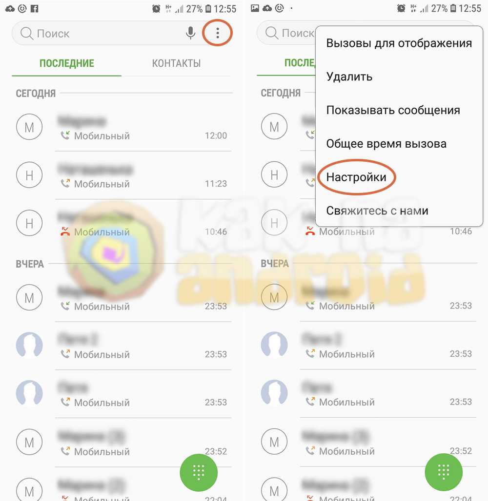 Открываем приложение “Телефон”, нажимаем на троеточие в верхнем правом углу экрана и среди вариантов контекстного меню выбираем пункт “Настройки”.