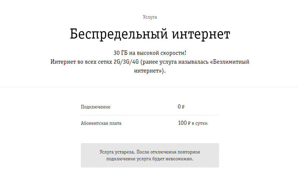 Докупать интернет выгодно с «Беспредельной» опцией. Пакет-гигант от Билайн предоставляет 30 Гб. Оплата– 100 руб./сутки. К сожалению, для подключения эта опция недоступна, так как находится в архиве.
