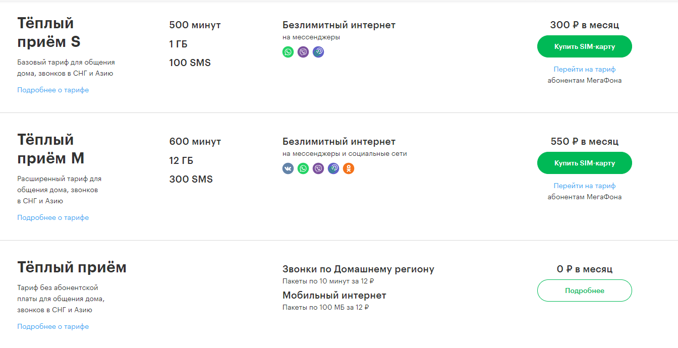 Идеальное предложение – Теплый прием. По базовой версии предоставляется десять минут внутри региона за 12 руб. За эту же сумму можно получить 100 мегабайт трафика. Стоимость звонков в соседние государства зависит от направления, начинается от 1 рубля.