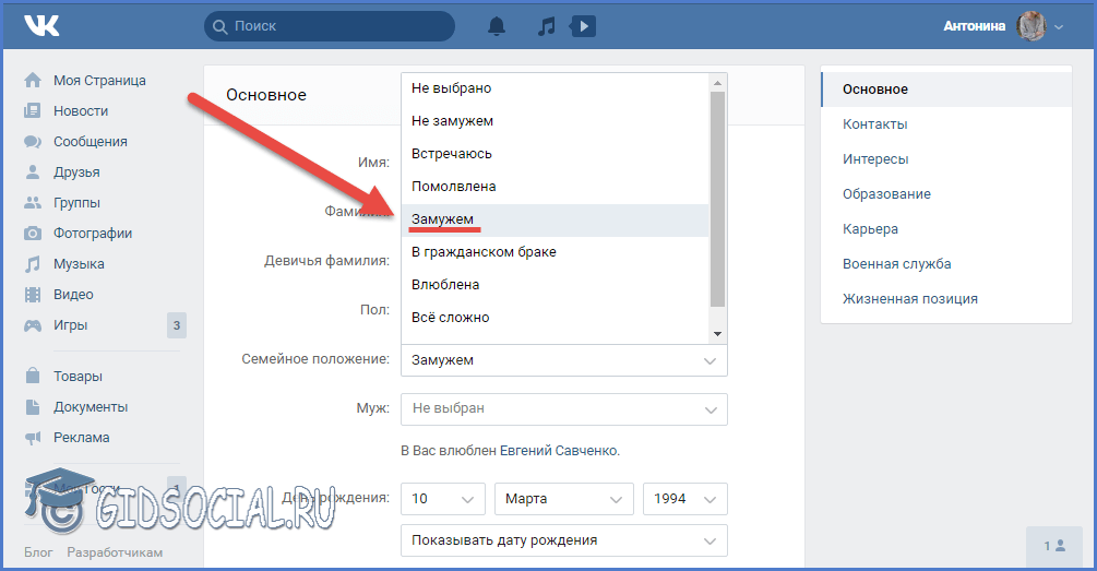 - Затем нужно сменить семейное положение на «Замужем» или «Женат» соответственно.