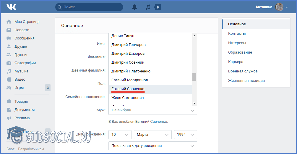 - После этого из списка нужно выбрать пользователя, с которым вы вступили в брак. Естественно, чтобы он появился в выпадающем списке, супругу или супруга нужно сначала добавить в друзья.
