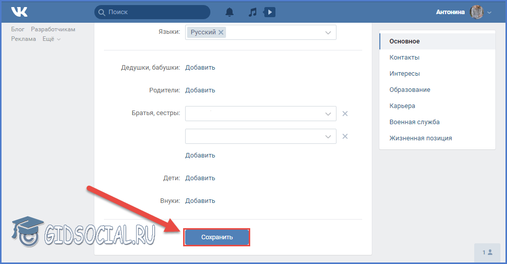 Пишем имя и фамилию (либо что-то одно) в окно с основной информацией. Обязательно нажимаем на кнопку «Сохранить».