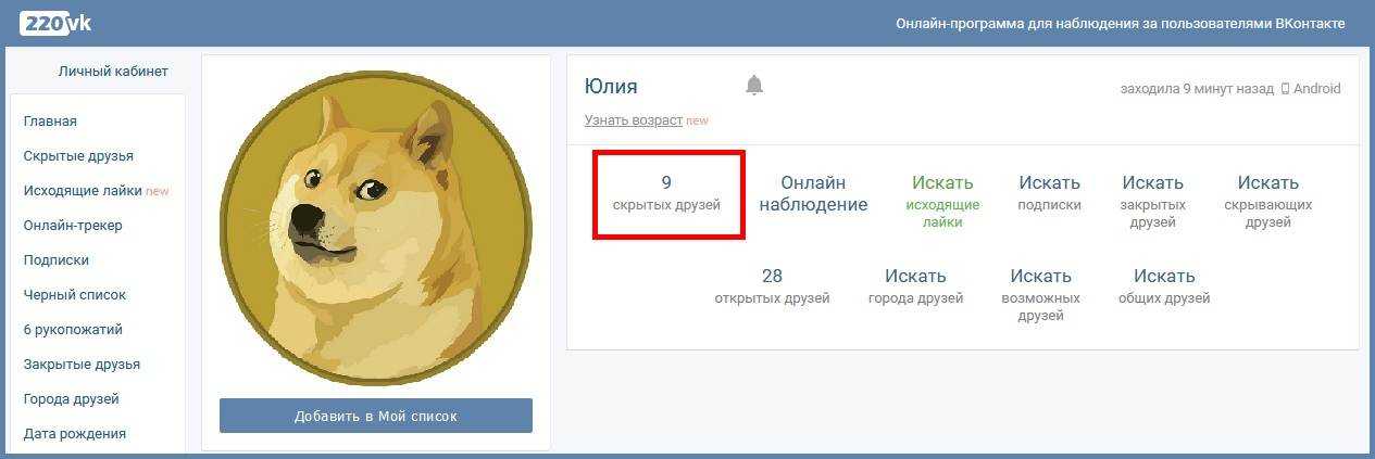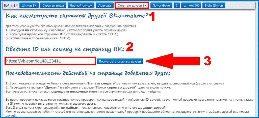 Ещё один популярный сервис, работающий аналогично 220ВК. Он позволяет посмотреть, кого скрывает выбранный пользователь. Для получения информации о спрятанных друзьях выполняем такие действия: