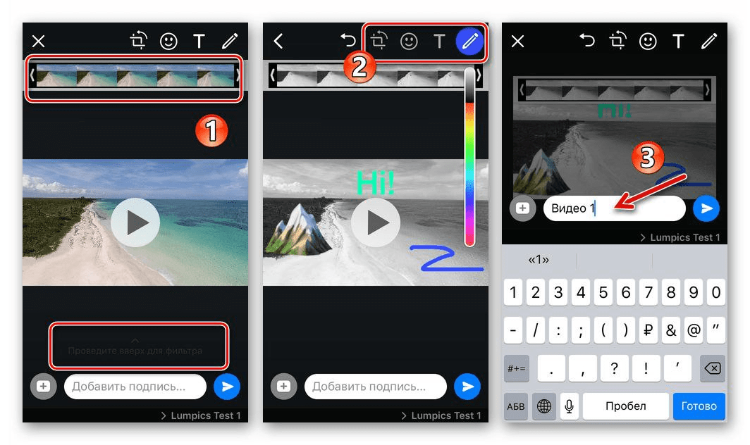 Выбранное видео автоматически подгружается в Ватсапе. Далее мы можем его отредактировать, например, сократив длительность, тем самым уменьшив вес ролика, добавить эффекты.