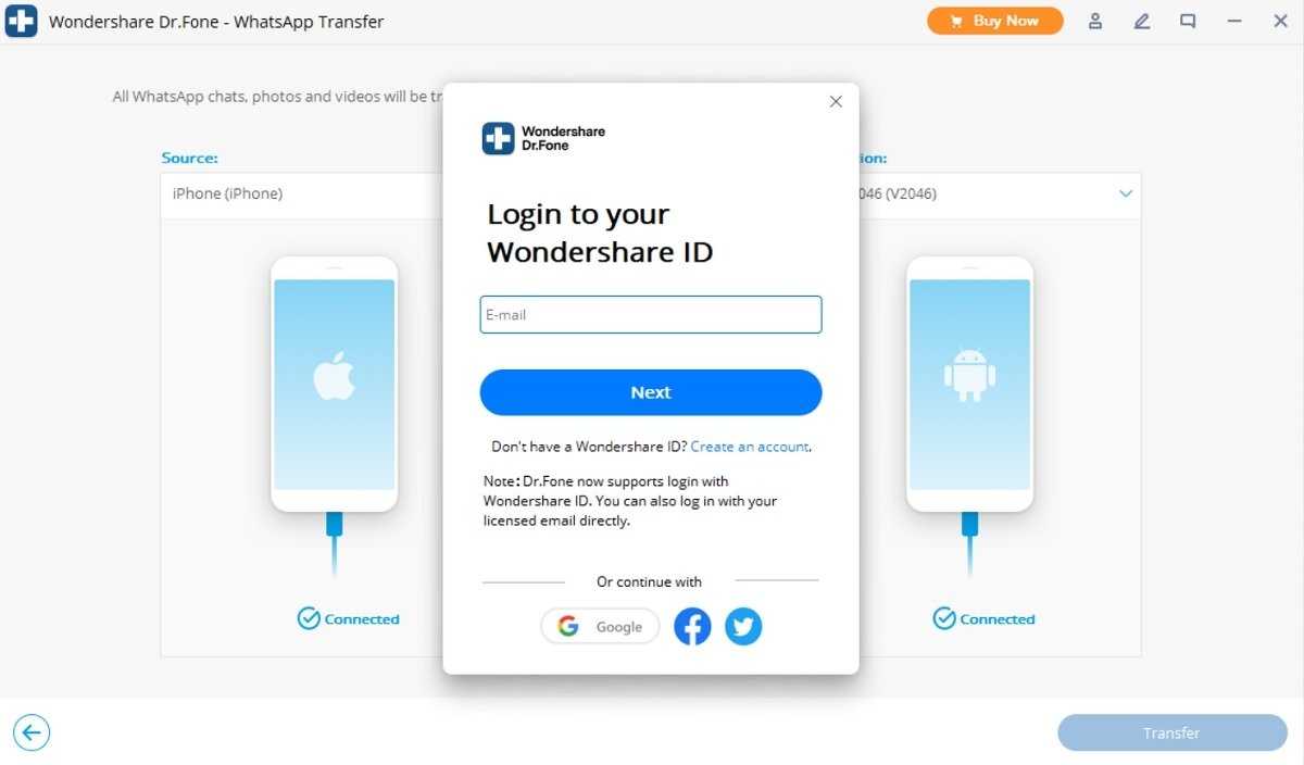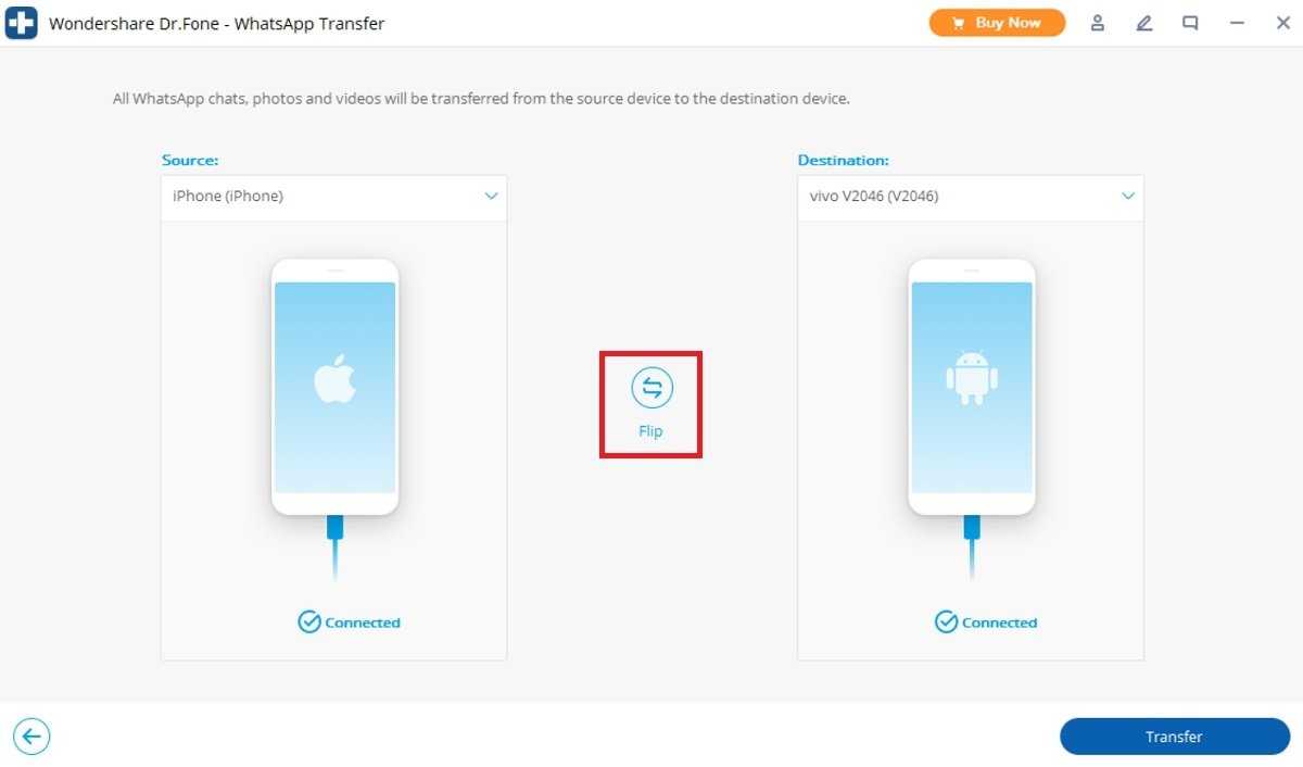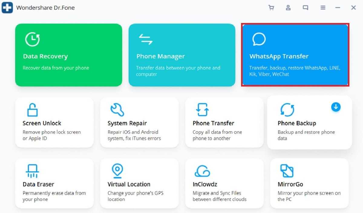Вам также понадобятся два порта USB для одновременного подключения iPhone и терминала Android. После того, как вы связали оба устройства, откройте dr.fone и нажмите WhatsApp Transfer.