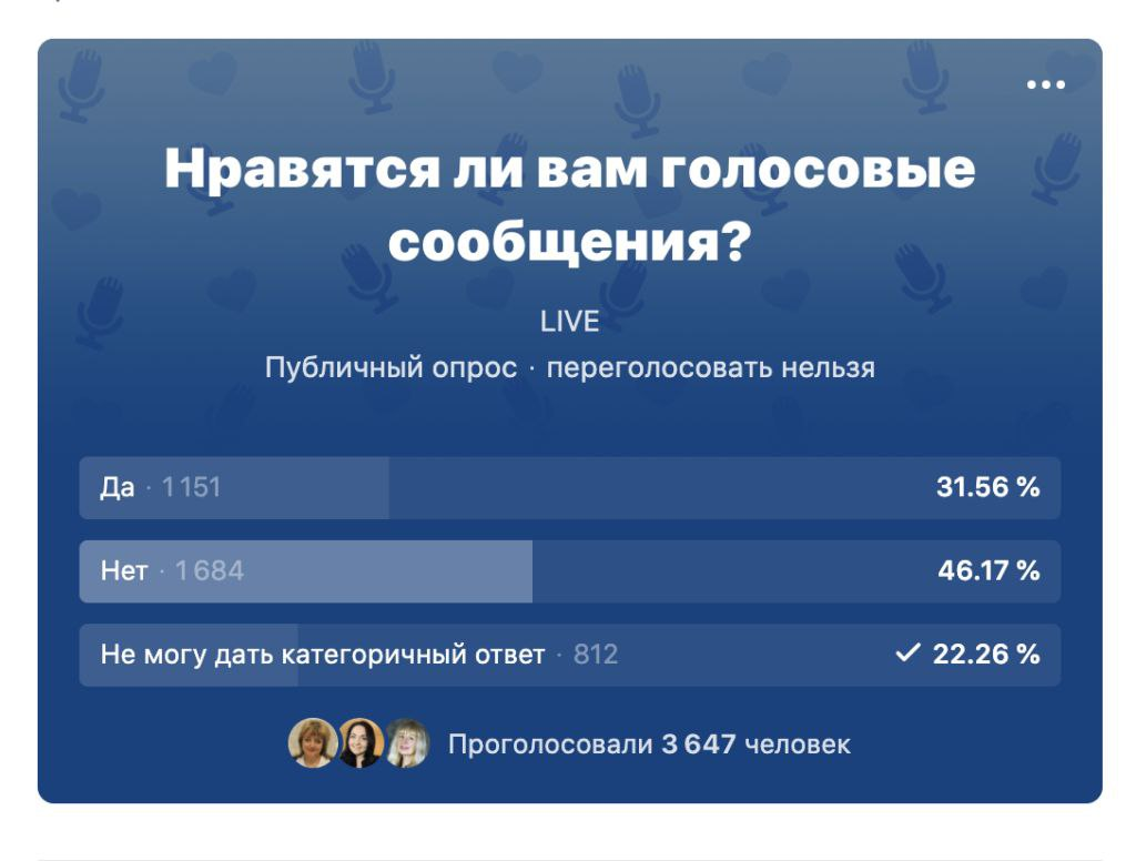Как только создатель опроса проголосует, он увидит сколько голосов набрал каждый вариант ответов в процентах, а также увидит количество людей, которые проголосовали. В анонимном опросе группы не видно, кто из её участников какой именно вариант выбрал. Доступна только статистика.