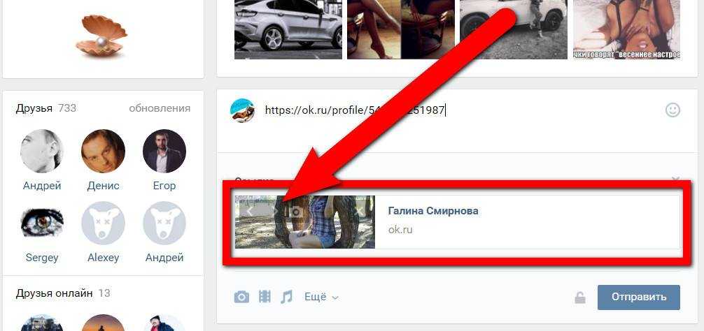Сначала в окно сообщения на стене вставьте ссылку на вашу страничку в одноклассниках. Она подгрузит с вашего профиля картинку и обрамит это в виде ссылки с картинкой. Но нам картинка эта не подходит. Нам нужна наша подготовленная. Для этого, нам понадобиться функция замены фото. Как показано на рисунке, вы увидите на автоматической подгрузке возможность выбрать фотку: