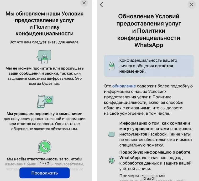 Также в СМИ появилась информации о том, что Ватсап будет также передавать личные пользовательские данные, однако, это не так случилось. Все из-за того, что в новых обновленных условиях такого нет. При этом только к бизнес-аккаунтам предъявляется такое требование, чтобы легче было обмениваться сообщениями и использовать платформу Facebook в том числе.