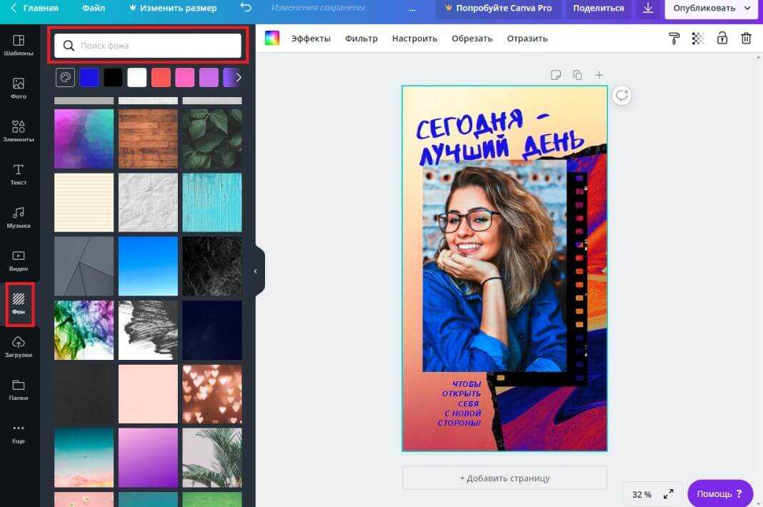 Зайдите в раздел «Фон», находящийся в боковом меню. Здесь представлены сотни профессиональных изображений, которые можно использовать в качестве фона. Вы также можете загружать собственные картинки или синхронизировать аккаунт с вашей социальной сетью, чтобы пользоваться снимками прямо из личных профилей.