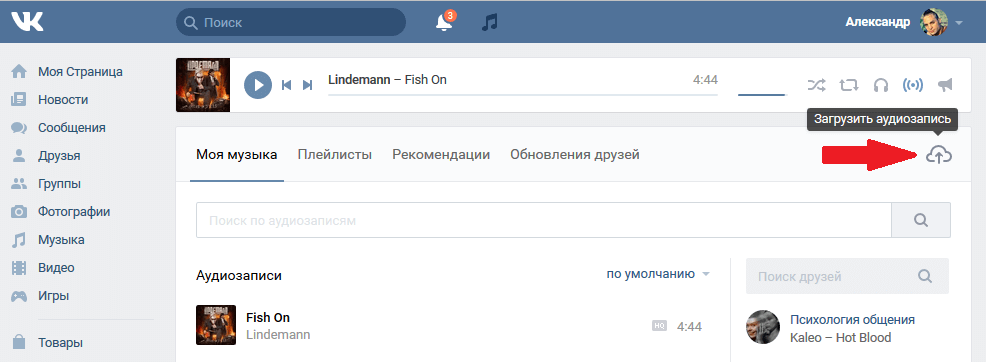 Чтобы залить музыку, необходимо войти в раздел «Музыка» в ВК, а затем нажать на облако в правом верхнем углу.