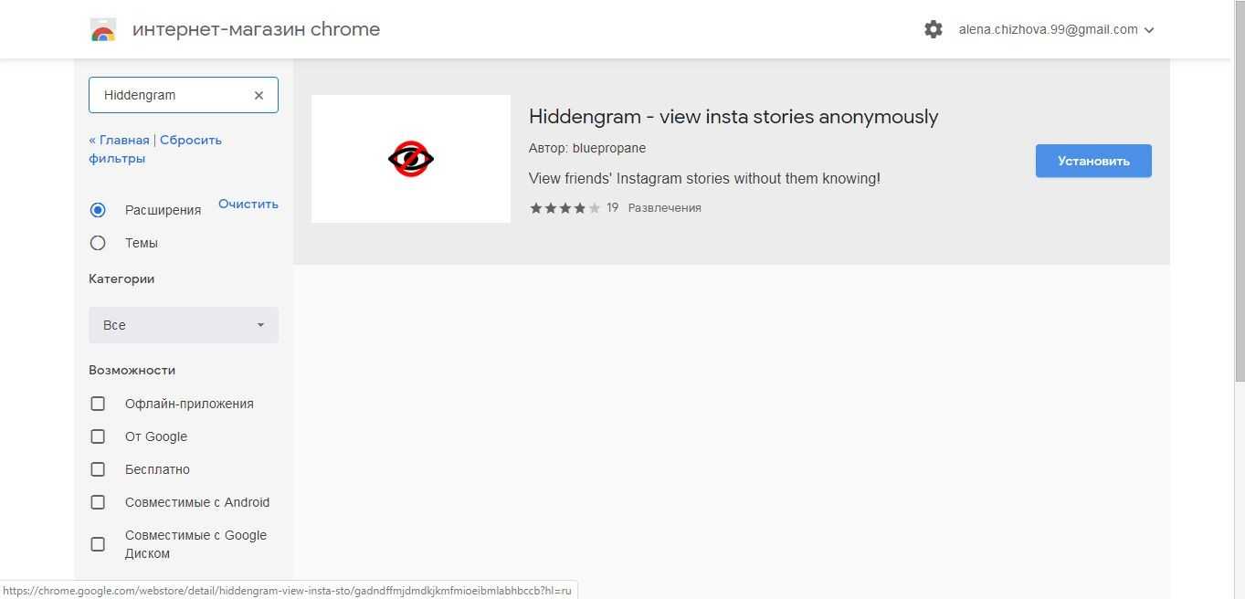 - Hiddengram– нажмите на значок дополнения в правом верхнем углу, чтобы он стал зачеркнутым. После можно смотреть истории привычным образом, ник не будет отображаться у автора записи.