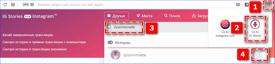 - IG Story – войдите в личный аккаунт на странице Instagram, нажмите на иконку расширения в верхней панели и выберите Go to IG Stories. В поисковой строке введите ник и запустите сторис кликом на глаз справа.