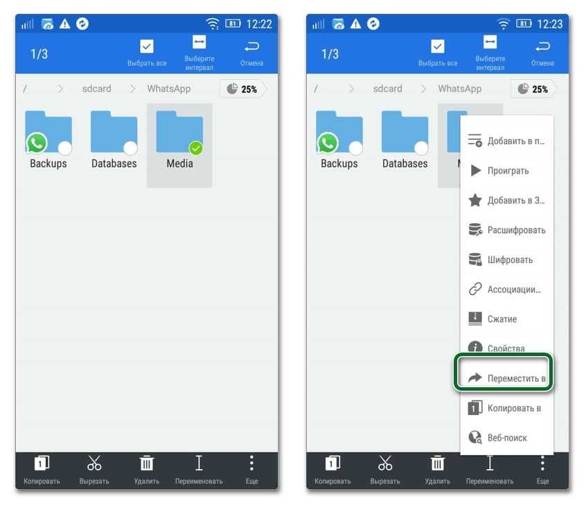 В первом случае нужно нажать и удерживать значок папки WhatsApp, после чего выбрать соответствующий пункт из меню. Чтобы перемещение медиа из «Ватсапа» не отменилось, не следует пользоваться экранной кнопкой «Назад» для навигации по файловой системе смартфона.