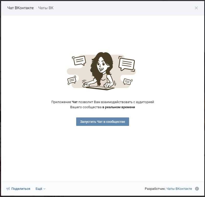При первом включении у Вас появится окно, в котором необходимо будет нажать «Запустить Чат в сообществе», чтобы он начал свою работу.