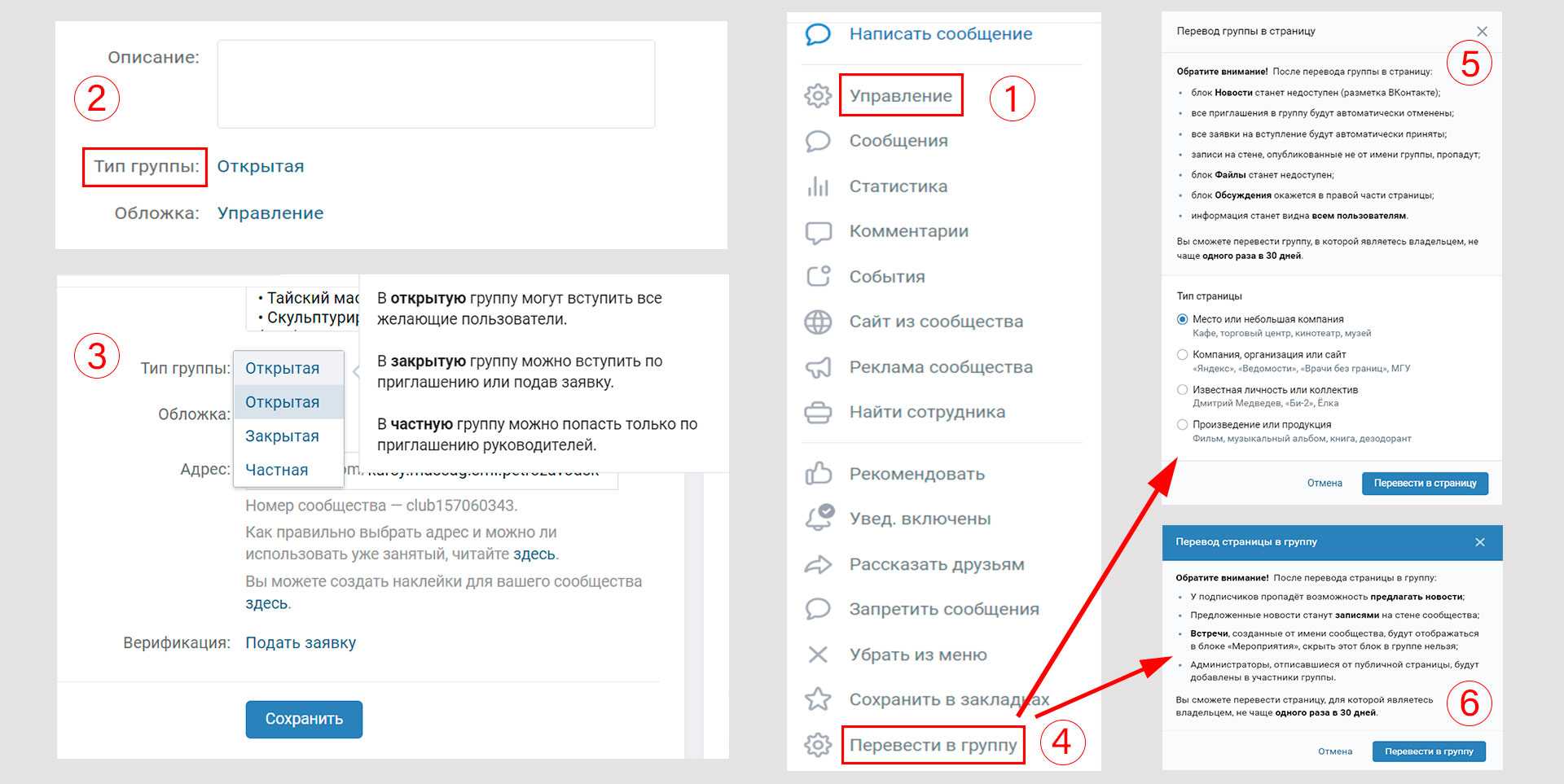 - Заходим в управление (1), смотрим в настройках в блоке слева есть ли после описания «Тип группы» (2). Если есть, то нажимаем и выбираем нужный тип (3).