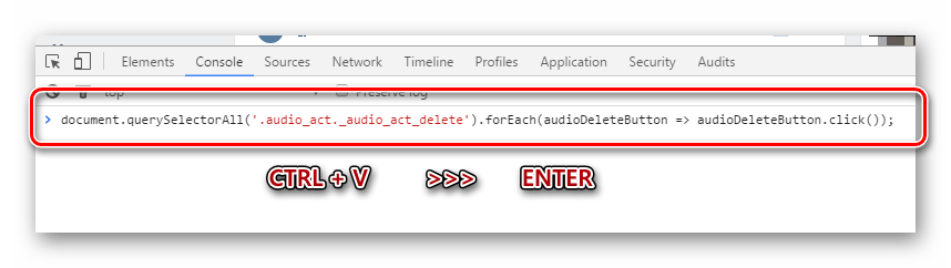 - Нажимаем Enter , чем запускаем процесс, направленный на удаление максимально возможного числа аудиозаписей социальной сети «».
