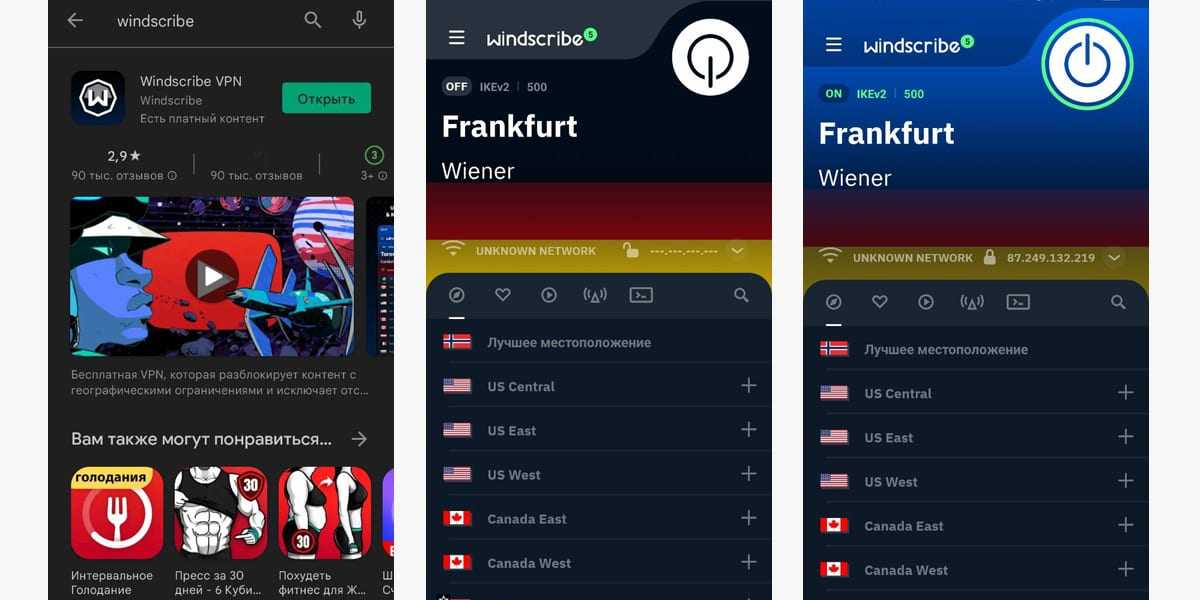 Чтобы зайти в Инстаграм* с VPN с телефона, нужно скачать и установить приложение. Найти нужный сервис можно в App Store или Google Play – смотря, какое у вас устройство. Я покажу процесс на примере бесплатного VPN для Андроида для Инстаграма*, которым пользуюсь сама – Windscribe. У него хорошая скорость, щедрый лимит бесплатного трафика, есть встроенный блокировщик рекламы и вредоносных программ.