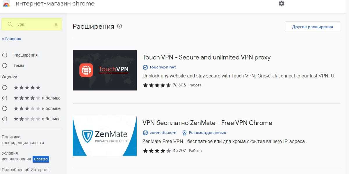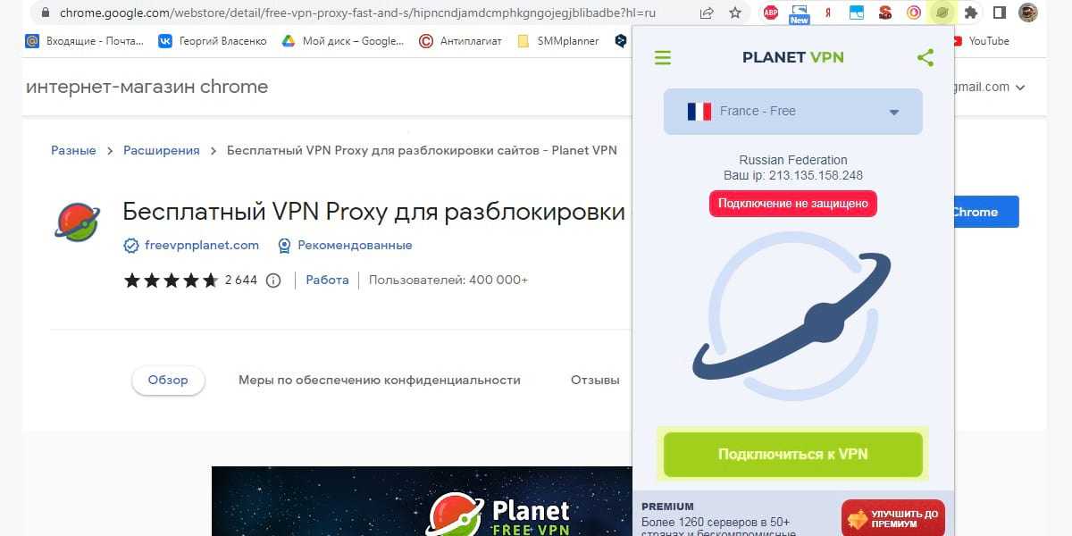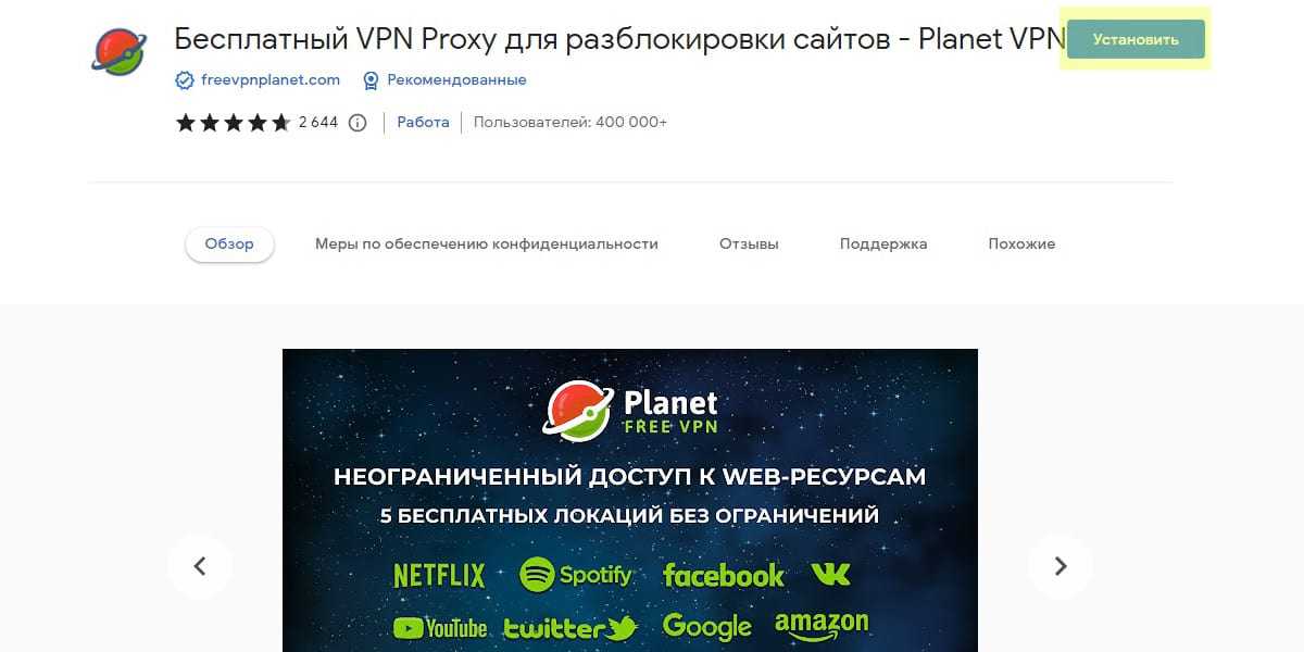 - нажмите на «Другие расширения» в правом верхнем углу, если хотите увидеть больше сервисов, выберите, какой вам больше нравится – у меня установлен Planet VPN (его также можно скачать на устройство);