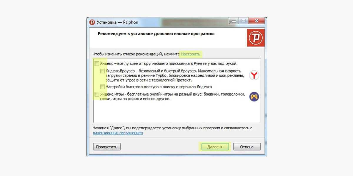 Нажмите «Настройки» и снимите галочки, прежде чем нажимать «Далее». В следующем окошке – тоже, если не хотите ярлыки онлайн-игр на рабочем столе