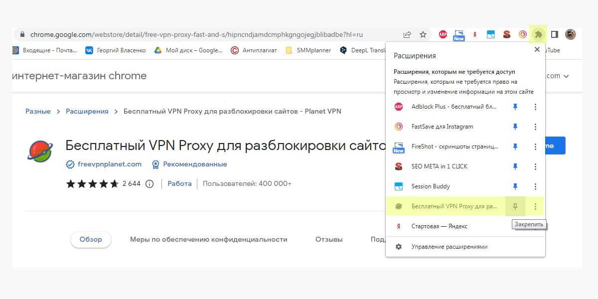 дождитесь окончания установки, зайдите в Расширения и закрепите значок на панели браузера, чтобы иметь быстрый доступ к VPN;