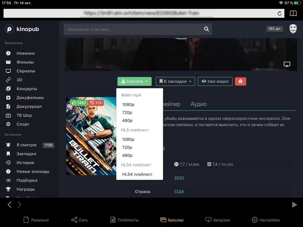 Мой любимый стриминговый сервис Kinopub позволяет загружать фильмы и сериалы для дальнейшего просмотра без подключения к сети, лишь бы места на устройстве хватало.