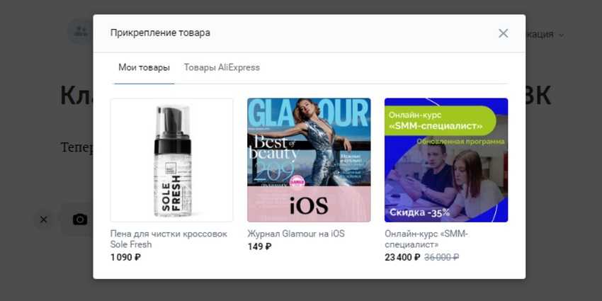 Товары. В статью можно прикреплять товары, которые вы добавили в избранное.