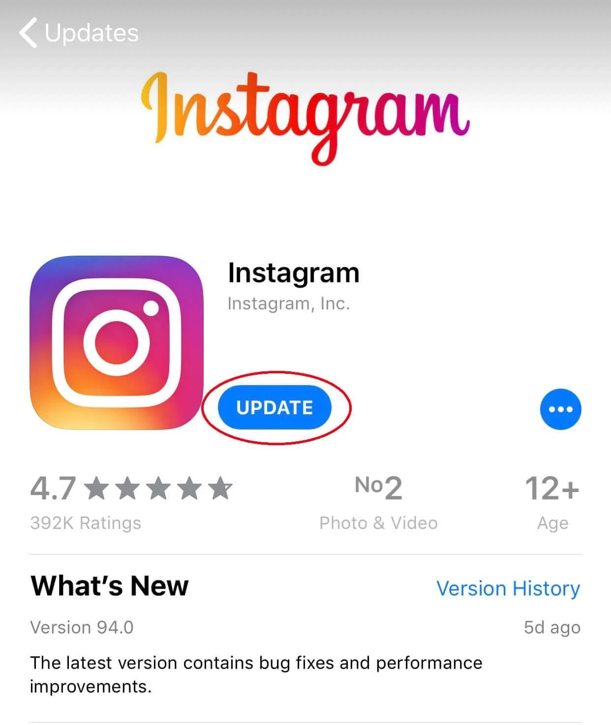 Посетите страницу Instagram в магазине приложений и тапните по кнопке «Обновить», чтобы инсталлировать новую версию клиента. В свежих редакциях исправляются ошибки и добавляются новые функции.