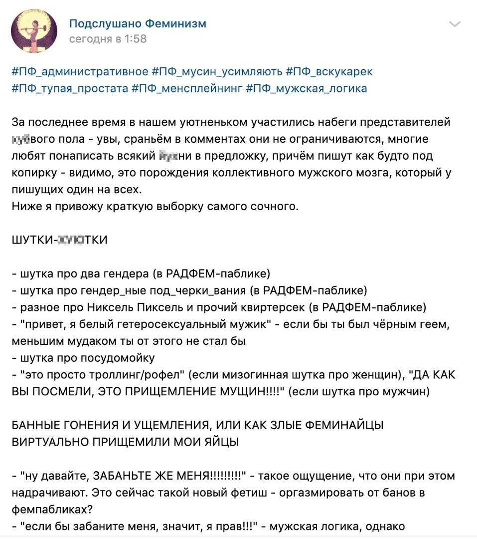 «НеТолерантноЖе)» и «ЯЖЕУГНЕТЕН» (на блокировку этих сообществ обратили внимание пользователи «ВКонтакте»).. Несмотря на это, было заблокировано огромное количество феминистских сообществ, причем даже самых популярных