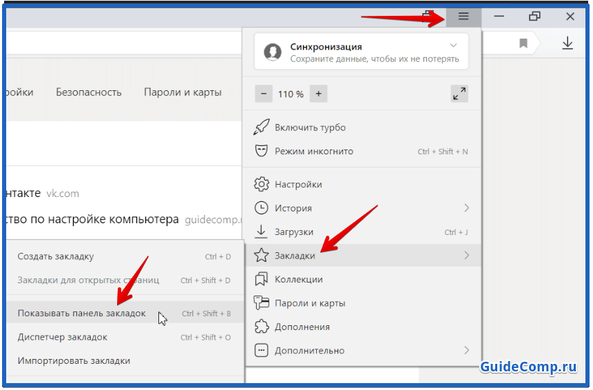 Сохраненные страницы добавляются в панель закладок. Если ее не видно, можете открыть, воспользовавшись настройками. Иконки с названиями сайтов появятся под адресной строкой, полный список можно посмотреть, щелкнув по значку ».