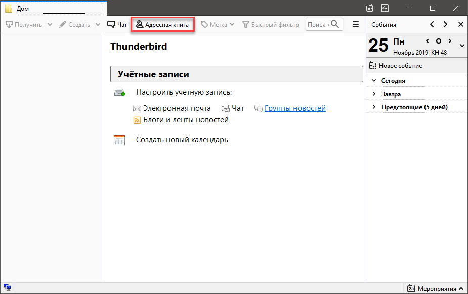 1 Для начала нужно скачать программу с официального сайта и установить ее. В этом ничего сложного нет. Затем запускаем клиент для просмотра электронной почты и щелкаем по пункту Адресная книга в верхней панели.