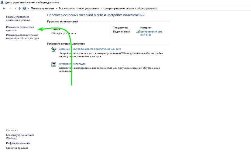 В открывшемся окне нужно нажать «Изменение параметров адаптера» в левой колонке.