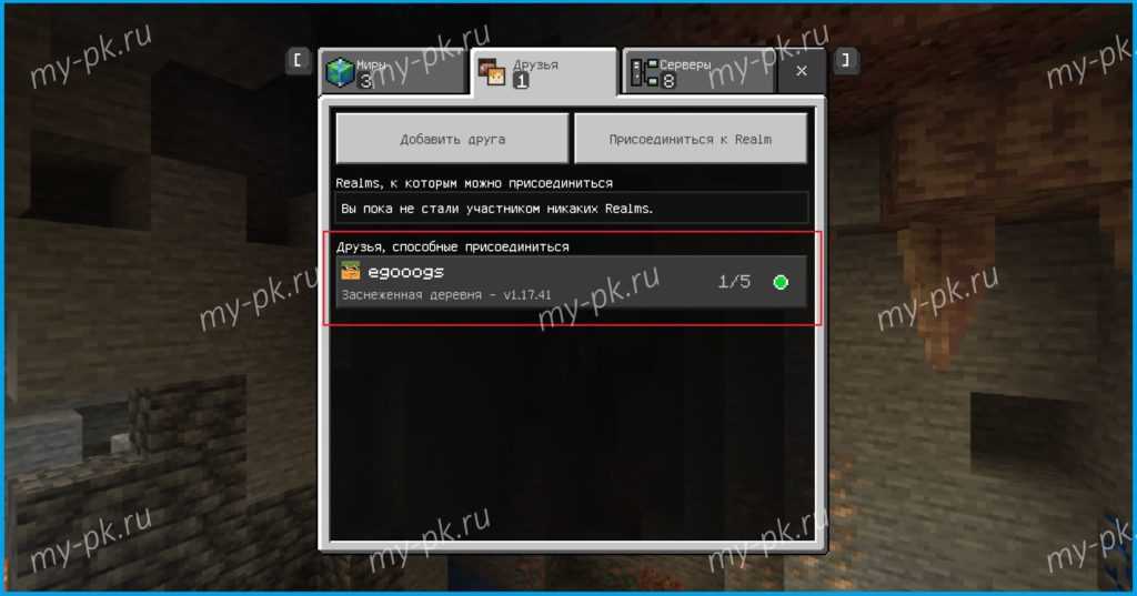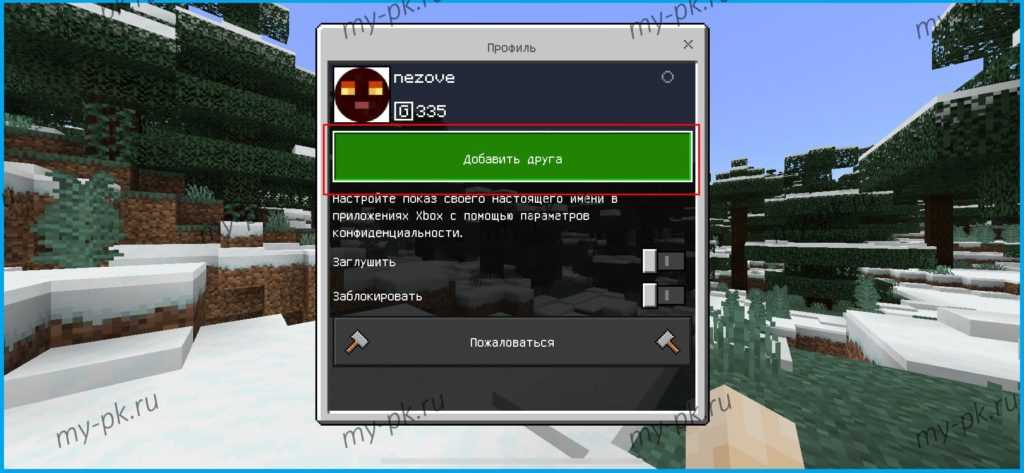 Далее жмём «Добавить друга» и прописываем ник другого игрока. На его телефоне отобразится запросы дружбы, принимайте! Возвращаемся назад на своём смартфоне и среди списка друзей находим соответствующего геймера. Теперь вы можете начать геймить, а ваш друг должен перейти в подраздел «Друзья» (в меню выбора мира) и найти там ваш телефон!