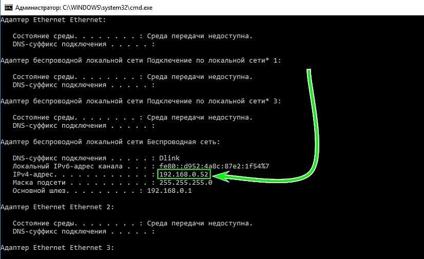 - Появится командная строка, в которой необходимо ввести команду ipconfig.