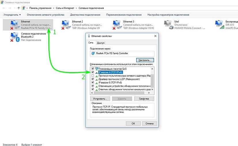 В открывшемся окне необходимо правой кнопкой нажать на иконке Ethernet-соединения и в выпадающем меню выбрать пункт «Свойства». Откроется меню настроек, в котором тебе нужно будет выбрать пункт «IP версии 4 (TCP/IPv4)».