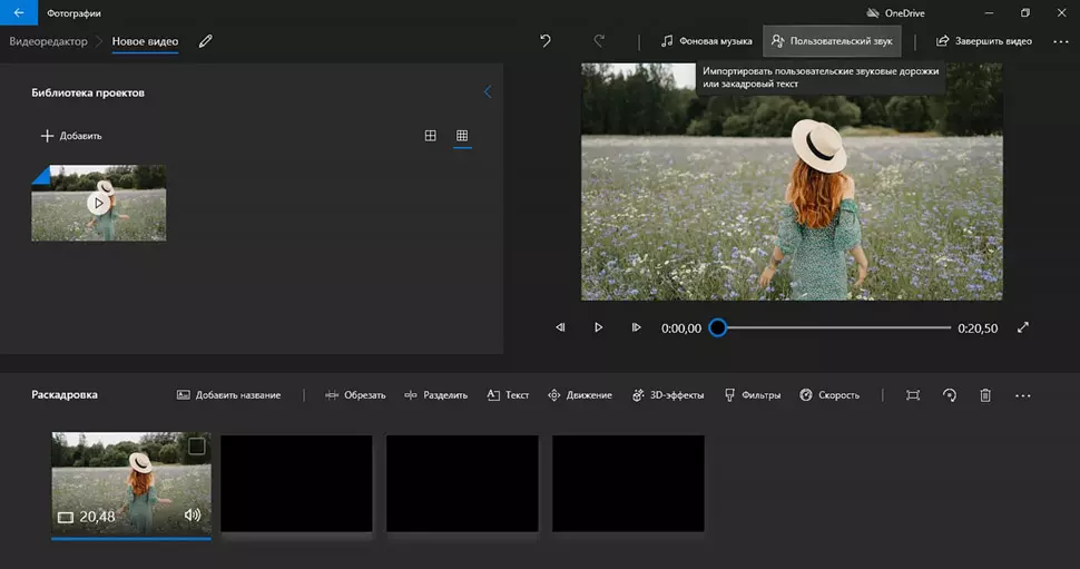 3. Вам потребуется указать название нового проекта, после чего откроется встроенный редактор Windows. Над окном предпросмотра найдите функцию «Пользовательский звук».