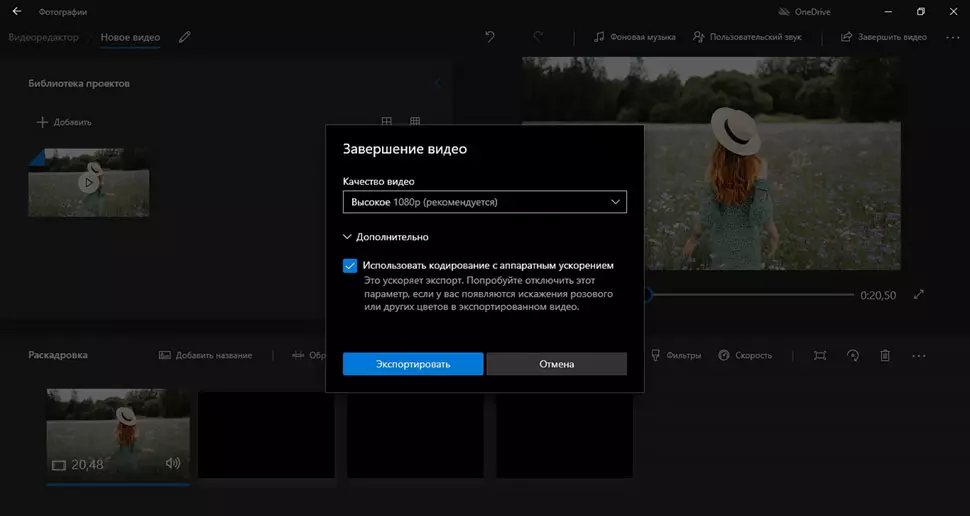 5. Кликните «Завершить видео». Выберите качество исходного клипа и нажмите «Экспортировать» для сохранения на ПК.