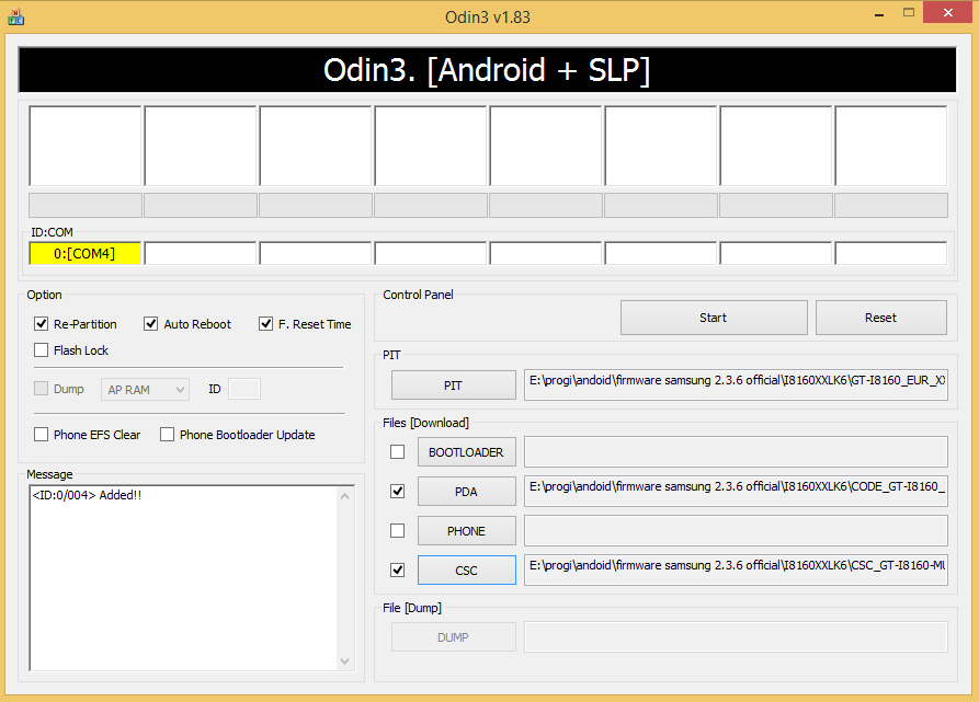 8. в Odin нажимаем кнопку Start и ждем, пока все файлы будут обновлены.