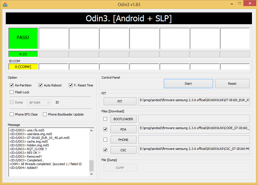 - в Odin нажимаем кнопку Start и ждем, пока все файлы будут обновлены.